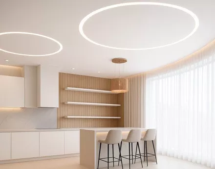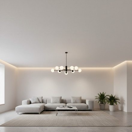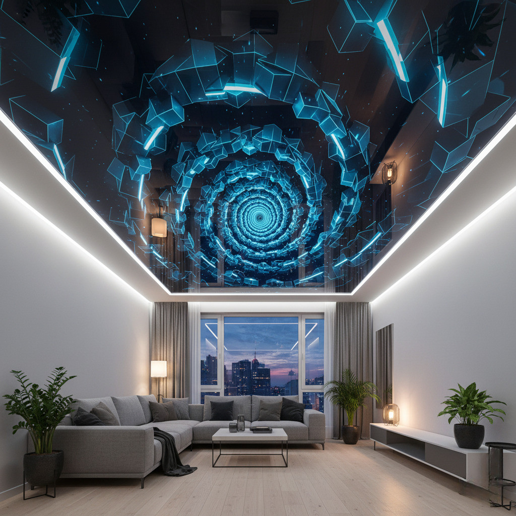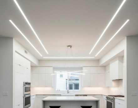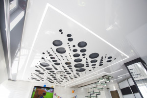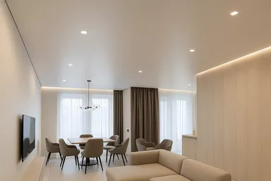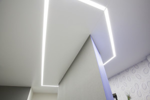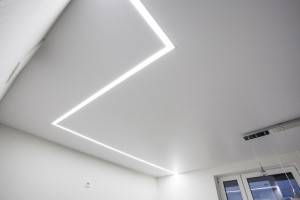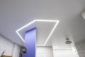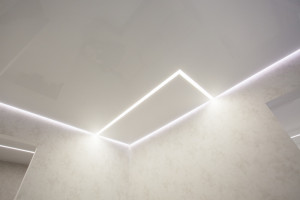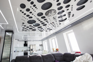 Фактурный потолок создает смелый акцент в интерьере, а для настоящего минимализма понадобится белый матовый бесщелевой. Ищете яркости? Ее обеспечит создание нового покрытия со встроенным освещением. В отличие от традиционного плафона оно смотрится более зрелищно.