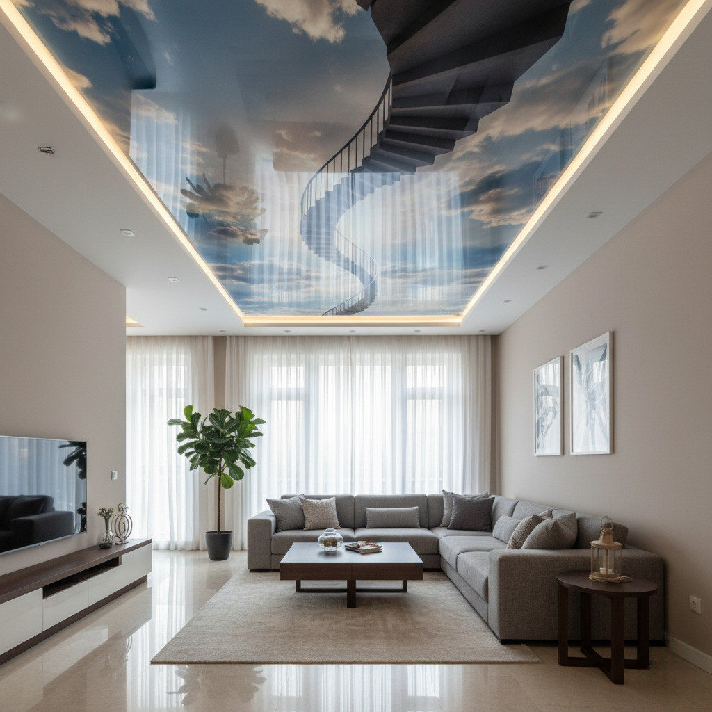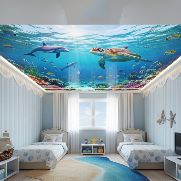 Чтобы интерьер помещения оказался максимально оригинальным и незаурядным, можно использовать 3д натяжные потолки со всевозможными интересными изображениями. Это могут быть абстрактные 3d-узоры или флористические мотивы, геометрические формы или полноценные 3d-рисунки – дизайн определяет цену натяжного полотна. Выбор того или иного варианта натяжного потолка с дизайном 3 д зависит от пожеланий покупателя, а также параметров помещения, к примеру, в маленьких комнатах более удачно смотрятся 3d-потолки с мелкими элементами.