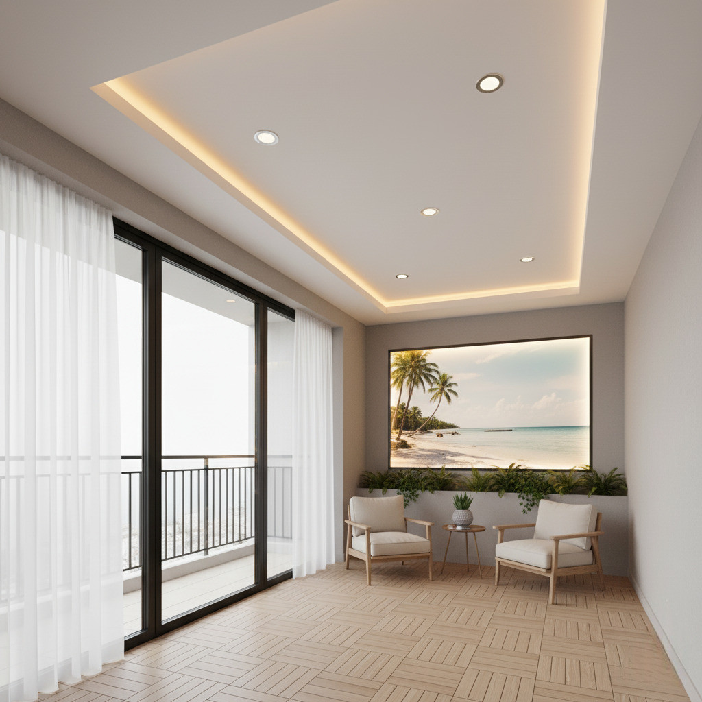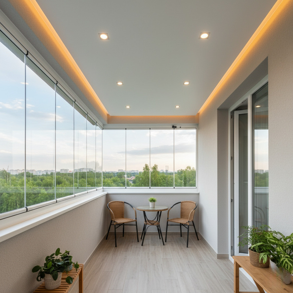 Выбор отделки на балкон имеет свою специфику. Подобранные материалы не должны бояться влаги, высоких и очень низких температур. Кроме того, отделка должна быть устойчива к воздействию прямых солнечных лучей – если материалы будут выгорать, то интерьер окажется непривлекательным. Всем указанным параметрам отвечают натяжные современные потолки. Помимо своего высокого качества, они также отличаются простотой монтажа – для установки таких полотен потребуется не больше нескольких часов.
