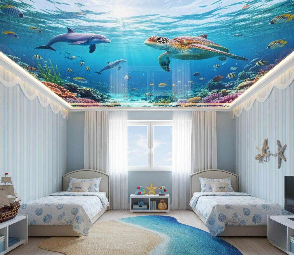 Последняя характеристика имеет особое значение при выборе натяжного потолка в детскую современную комнату. Покупатель может подобрать классический вариант – белое или бежевое полотно, либо отдать предпочтение более оригинальным моделям, выполненным в ярких цветах или даже с интересными рисунками. Если помещение имеет большие размеры, можно в детскую комнату купить потолки натяжные с 3д изображениями на различную тематику.